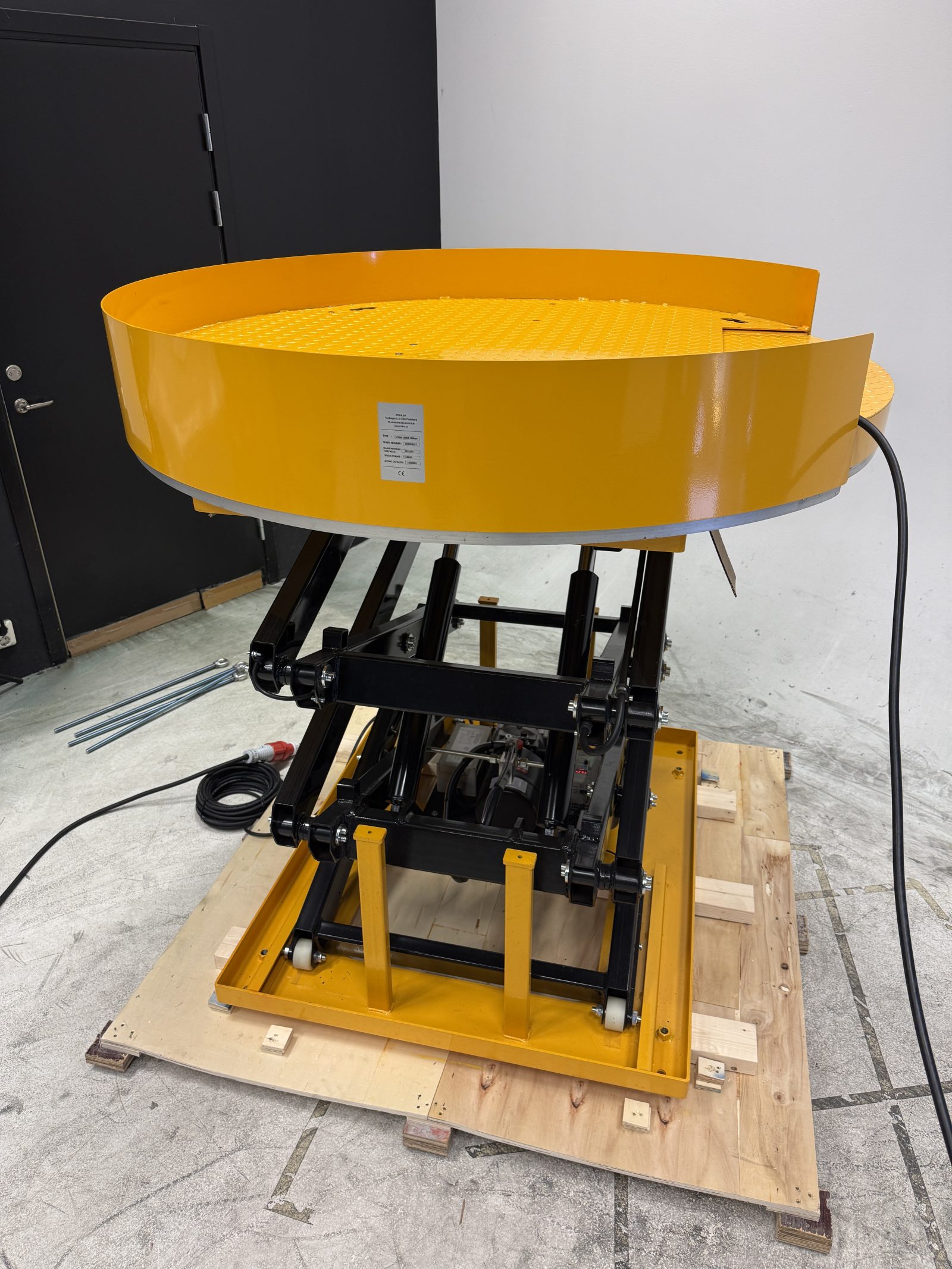 Kundanpassat lyftbord med 360 grader roterande topp, infällbar lucka, samt skyddslist. Specialanpassat för arbetsplattform uppe i silos, därav infällbar lucka för att kunna nå bordet när det är upphissat i silon.