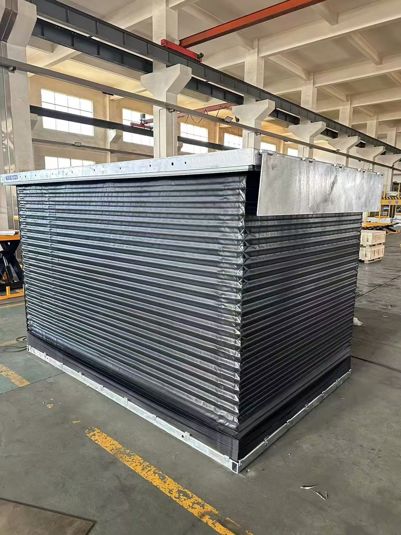 Galvaniserat lyftbord med dammskydd och fast ramp.